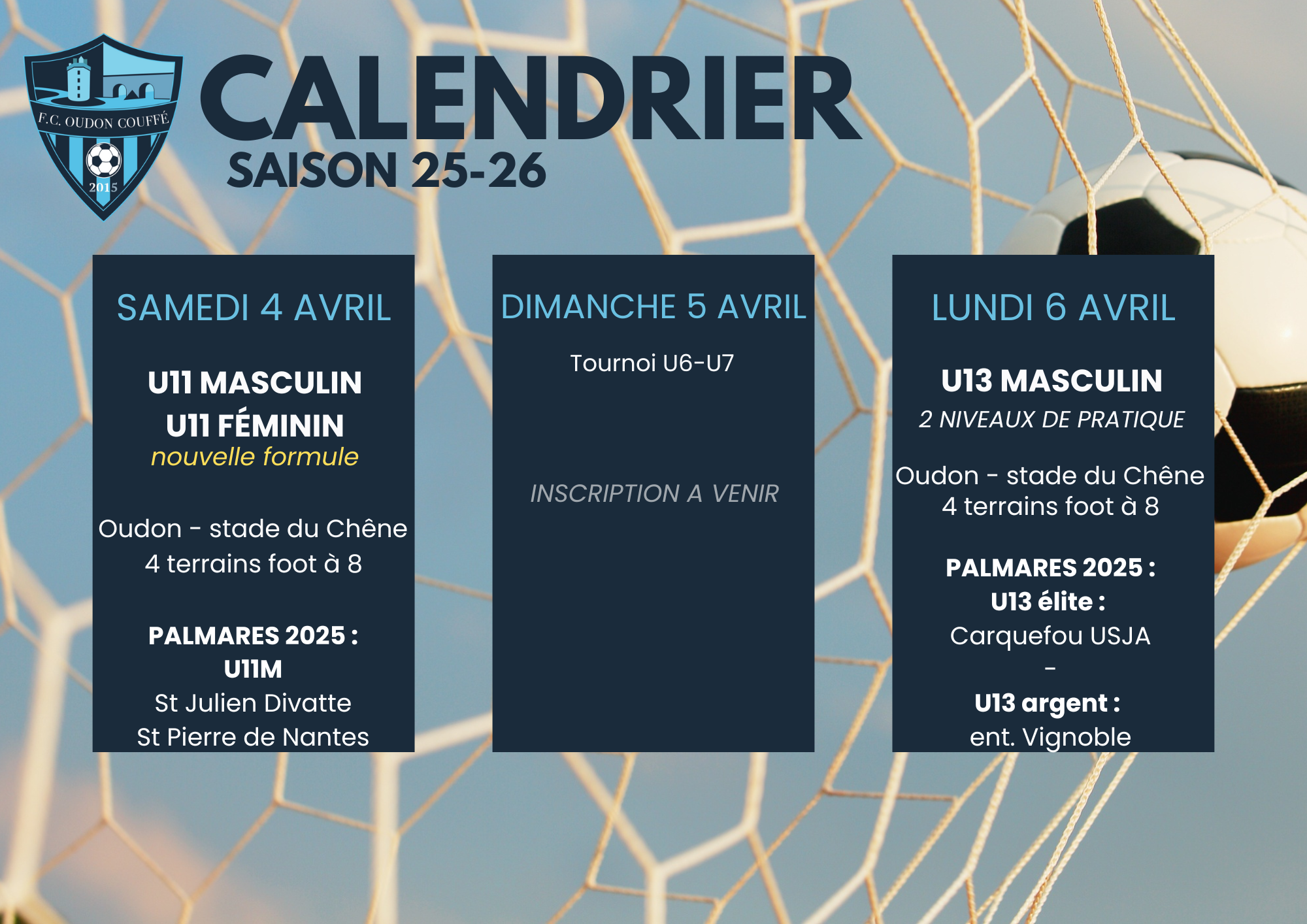 Lieu : lundi et mardi :OUDON - Stade du Chêne / mercredi : COUFFE - stade municipal