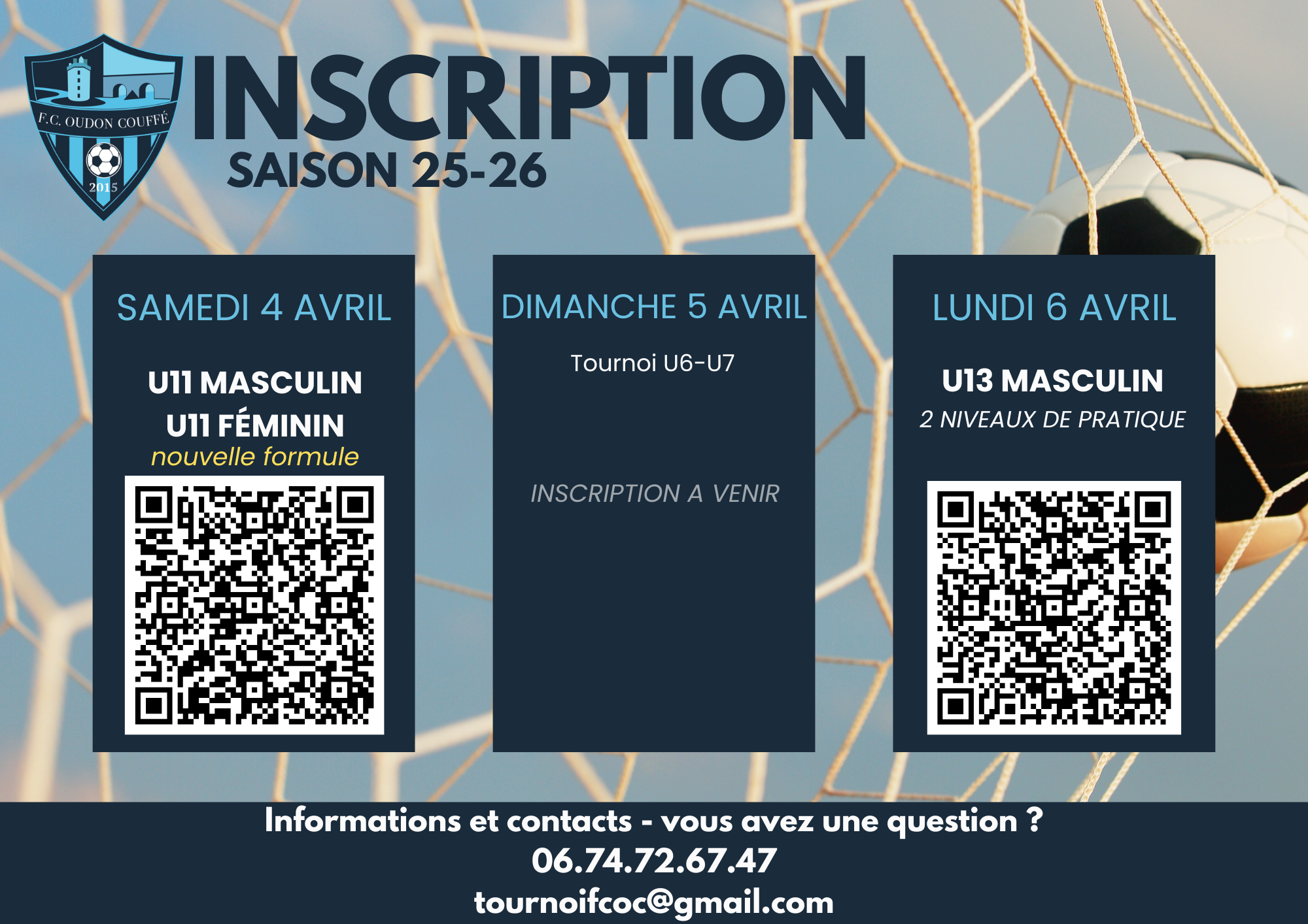 - enfants nés en 2013-2012 : Mercredi de 14h30 à 16h00 stade municipal de Couffé. Vendredi de 18h30 à 20h00 Stade du Chêne à Oudon. CONTACT : Thomas Guéron 06.74.72.67.47